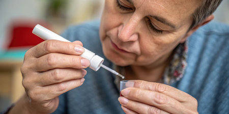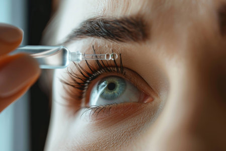 Close-up of a woman applying eye drops, focusing on her blue eye and delicate eyelashes, indoors with soft natural lighting. Health and wellness concept.