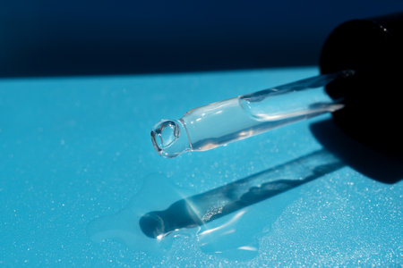 close up of pipette with pouring liquid serum and shadows on blue background. Trendy cosmetics shot with hard shadows