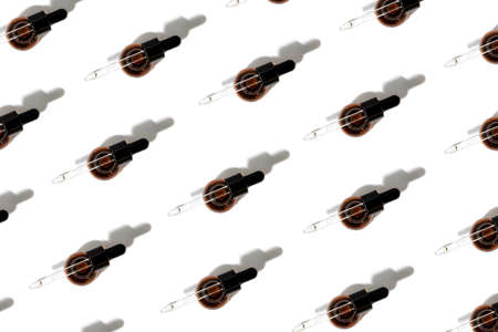 Pattern of open amber bottle with pipette on an white table with face care product. Top view