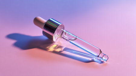 Glass pipette with cosmetic oil on a pink-blue background.