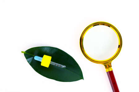 Empty amber glass essential oil bottle with a pipette on a background of green leaves and a magnifier. Copy space
