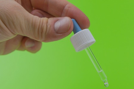 Pipette in a hand of the person on green background. With liquid inside close-up