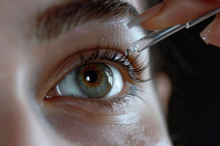A close up of a person applying eye drops with a dropper to a beautiful eye The focus shows the texture of the skin and eyelash details