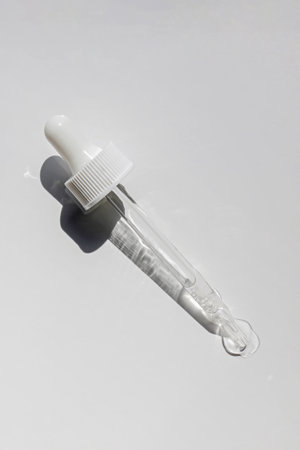 close up of pipette with pouring liquid serum on white background. Trendy cosmetic shot. skincare concept.