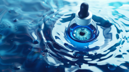 A banner ad for eye drop products with a circled eye drop bottle floating in a bubble over a blue ripple surface.