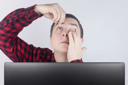 Close-up of eye drops. Artificial tear. Pain in the eyes. Sensation of grit in the eyes. A man looks out from behind a computer monitor or laptop. Drip my own eye medicine
