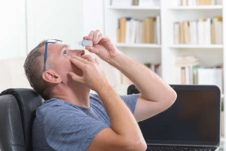 Man applying eye drops after a long sitting at computer