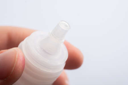 Hand holding eye or ear drop bottle on white background