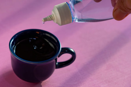 person sweetening coffee with liquid sweetener, scene showing cup and flask