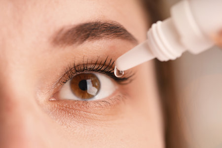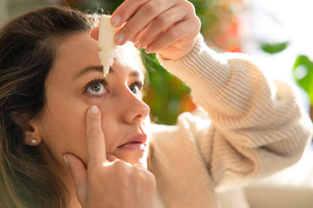 Close up view of woman using eye drops