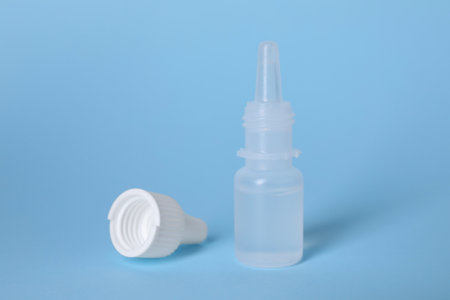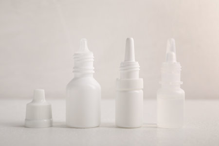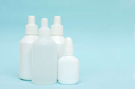 Eye drop or ear drop bottles on light blue background. Blank white plastic container for fluid. Pharmaceutical packaging product.