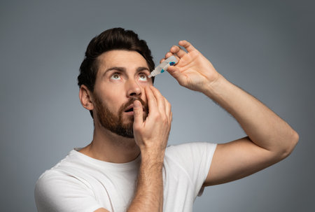 Handsone bearded caucasian man applying ophthalmology eyedropper, standing on grey studio background