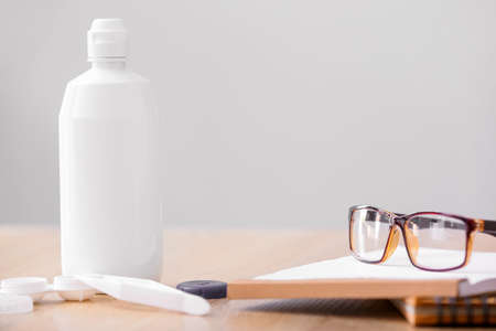 Container with contact lenses, solution, eyeglasses and tweezers on table