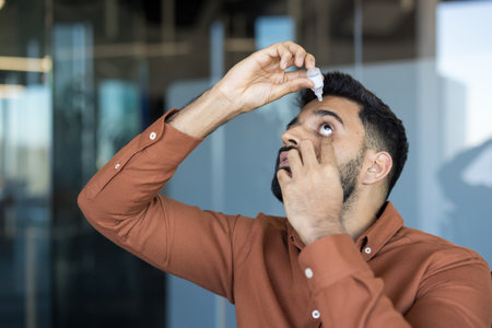Man using an eye dropper, gently pulling down his lower eyelid and looking up, administering medicine to relieve symptoms of dry eyes, irritation, and improving eye health in an office environment