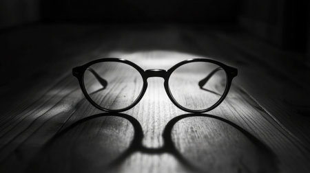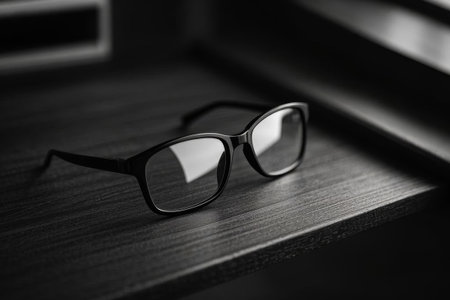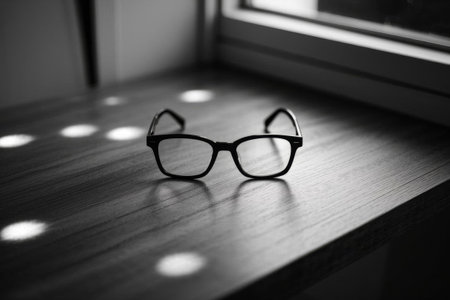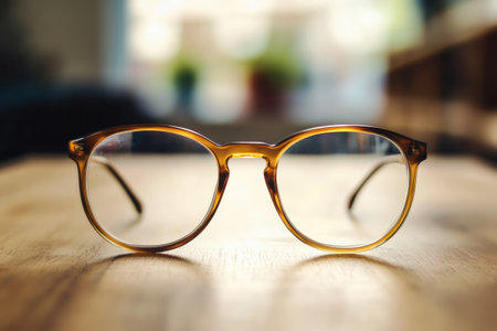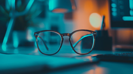 A pair of classic glasses placed on a modern desk with a soft focus and warm lighting in the background, symbolizing focus, work, and a cozy workspace.