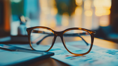 Close-up of reading glasses placed on financial documents with soft background lighting, representing focus, analysis, and business planning.
