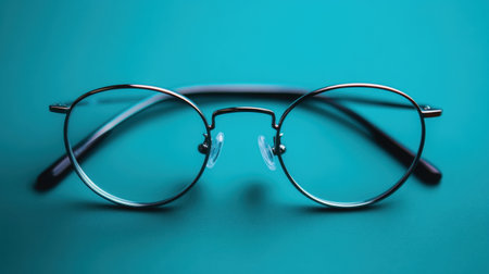 Minimalist close-up of round eyeglasses placed on a turquoise surface, highlighted by soft sunlight creating an artistic shadow. Perfect for themes of vision, style, and simplicity.