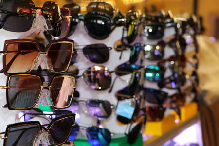 Sunglasses with colored lenses in shop window