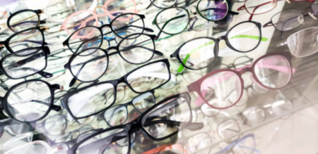 Blurred Eyeglasses Frames Displayed in Optical Store Showcase, For Background, Various eyeglasses frames displayed on glass shelves. Fashionable eyewear, Vision care, retail shopping lifestyle concept