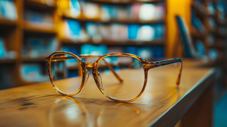 Close-up of vintage-style eyeglasses resting on a wooden desk with a blurred library backdrop, creating a scholarly and nostalgic ambiance.