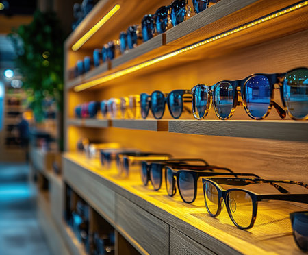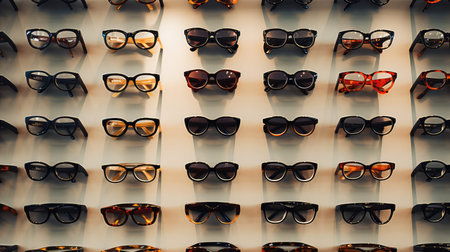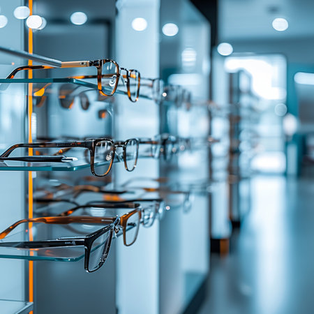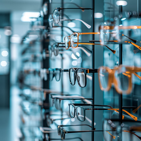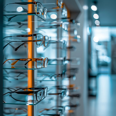 Stylish eyeglasses are neatly arranged on a glass shelf, showcasing the latest trends in eyewear fashion and eye care