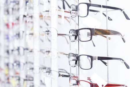 Optical eyeglasses on display in optics store. Selective focus.