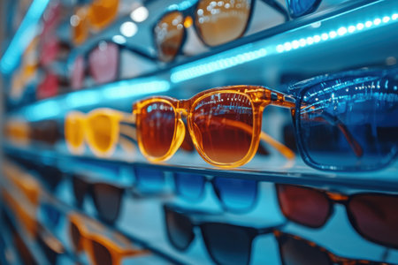 A variety of sunglasses lines a bright display in a retail store. The vibrant frames in hues of orange and blue attract attention, reflecting summer vibes and trendy fashion options for shoppers.