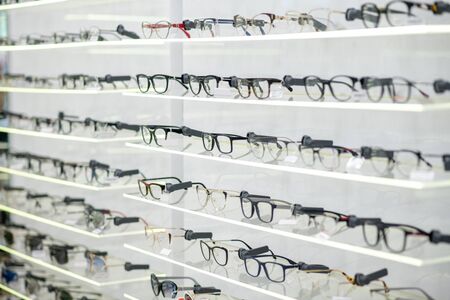 Glasses for sight and vision correction in a row in optical store