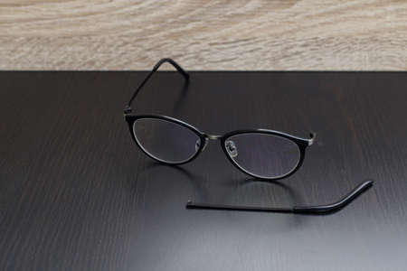 Black glasses on a wooden table close up