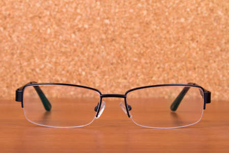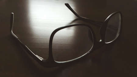 Eyeglasses on wooden table.