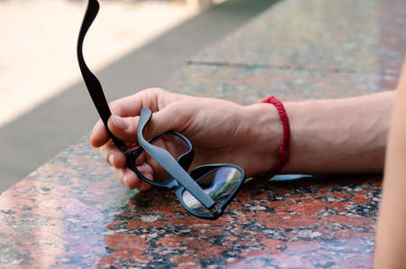 Hand of young Caucasian man is holding black rimmed glasses. Hand with glasses on granite surface outdoors. Lifestyle. Selective focus.