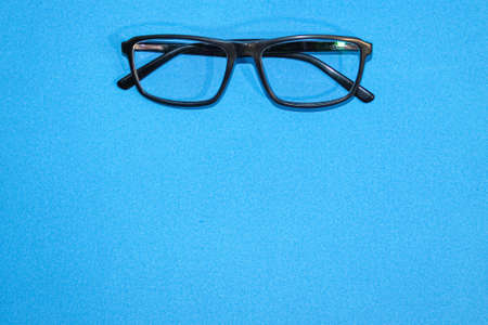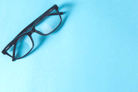 Black-rimmed glasses with diopters on a blue paper background. Banner, template. Space for text.
