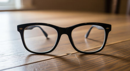 Classic black frame eyeglasses with clear lenses resting on a rustic wooden table. soft light highlights the texture of the wood and the sleek design of the eyewear, suggesting a moment of pause or study.