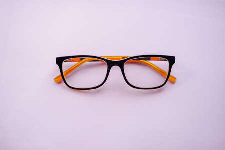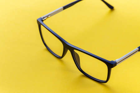 glasses with transparent lenses with diopters on a yellow background. stylish accessory