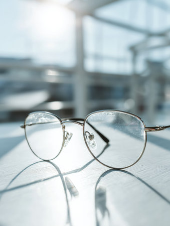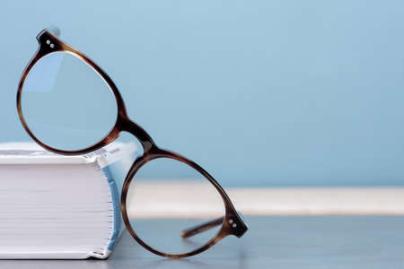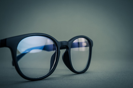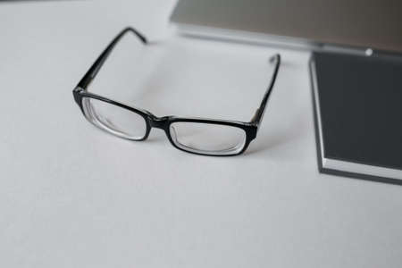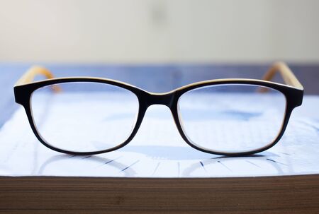 eyeglasses on the table in front of the light background.