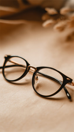 Stylish black frame glasses rest on beige paper, creating an elegant backdrop for branding or promotional content.