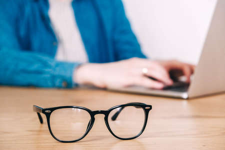 Eyeglasses on table near notebooks and computers in office