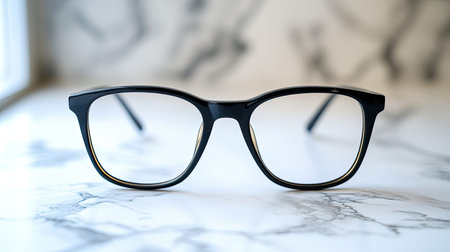A pair of stylish black eyeglasses rests on a marble surface, elegantly illuminated by natural light. The sleek frames showcase modern design, ideal for fashion enthusiasts.