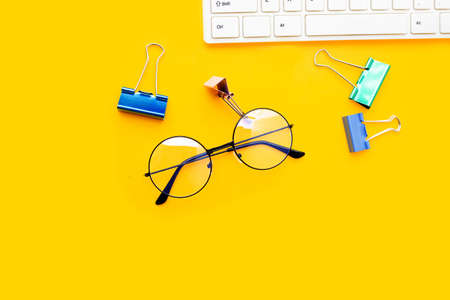 Eye glasses with paper clips and white computer keyboard on yellow background.
