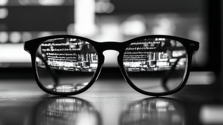Black-framed eyeglasses with clear lenses, reflecting text and data, resting on a surface, close-up view. The glasses have a classic design.