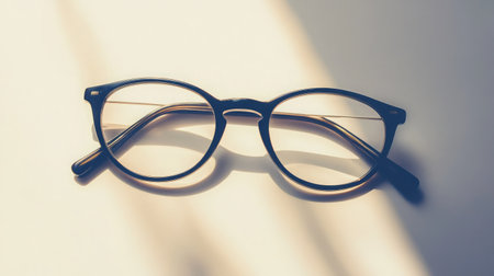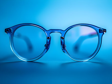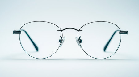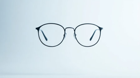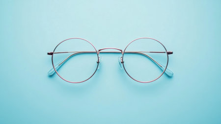 A pair of stylish round glasses rests centered on a soft blue background, embodying contemporary fashion and clarity in design, ideal for creative and lifestyle themes.