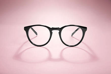 Stylish eyeglasses on color background