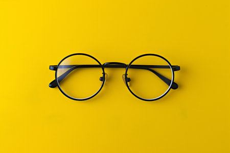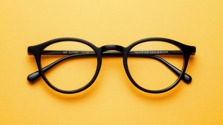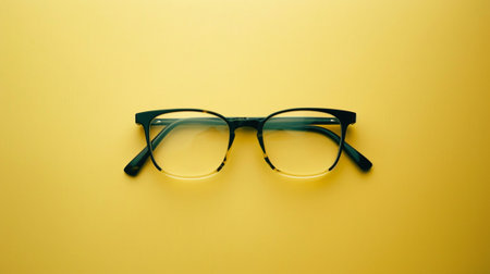 A pair of stylish black eyeglasses sits on a vibrant yellow background, offering a modern and minimalist aesthetic. Ideal for fashion and accessory showcases.