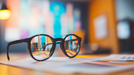 A pair of eyeglasses resting on documents with a blurred colorful background, symbolizing vision, focus, and modern workspace environments.