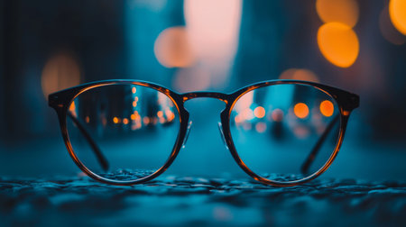 A pair of eyeglasses placed on a surface with blurred city lights in the background, symbolizing focus, vision, and urban lifestyle.