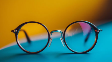 Close-up of stylish round eyeglasses with a vibrant yellow and blue background, creating a modern and playful aesthetic. Ideal for themes of fashion, accessories, and optical style.