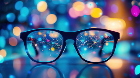 Close-up shot of stylish round glasses resting on a wooden table, featuring reflections and vibrant bokeh lighting in the background, showcasing modern elegance.