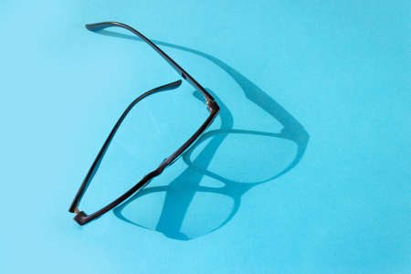 Glasses with a black frame on a blue background. Hard shadow from glasses. Vision concept.