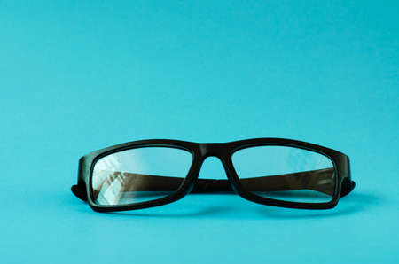 Glasses in black plastic frames on a blue background