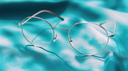 A pair of elegant round glasses rests gracefully on soft turquoise fabric, showcasing a stylish optical accessory ideal for fashion-forward individuals.
